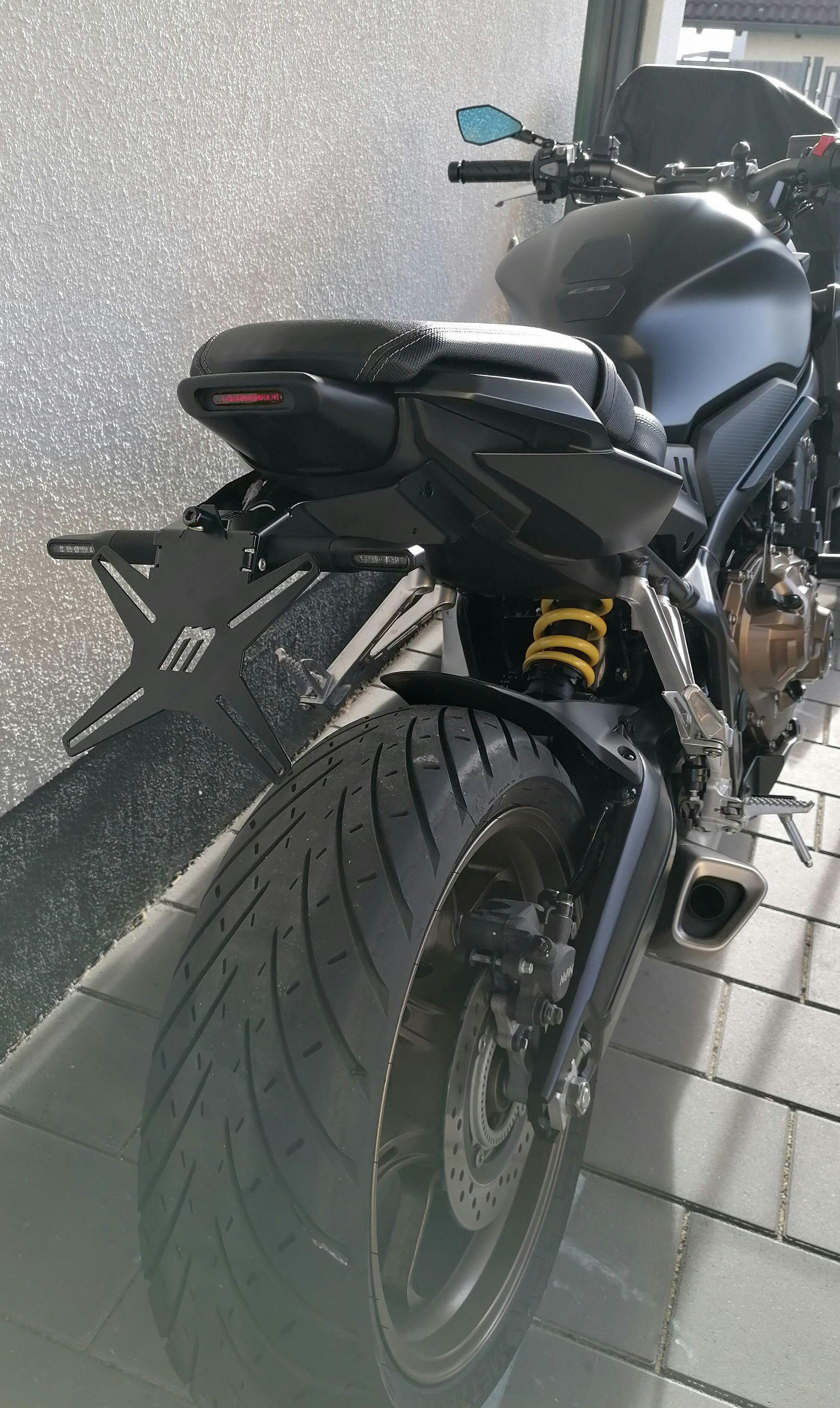 - CB650R Kennzeichenhalter: Mit dem für die Honda CB650R Neo Sports Café 2021 - 2024 entwickelten Kennzeichenhalter bekommt dein Bike ein cleanes und sportliches Upgrade am Heck. Die Montage erfolgt an der originalen Heckaufnahme und benötigt daher nur wenige Schritte.